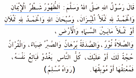 1) "At-Tahoor, shatrul 'imaan - Purification is half of faith". (Hadith number 23, on Kalamullah)